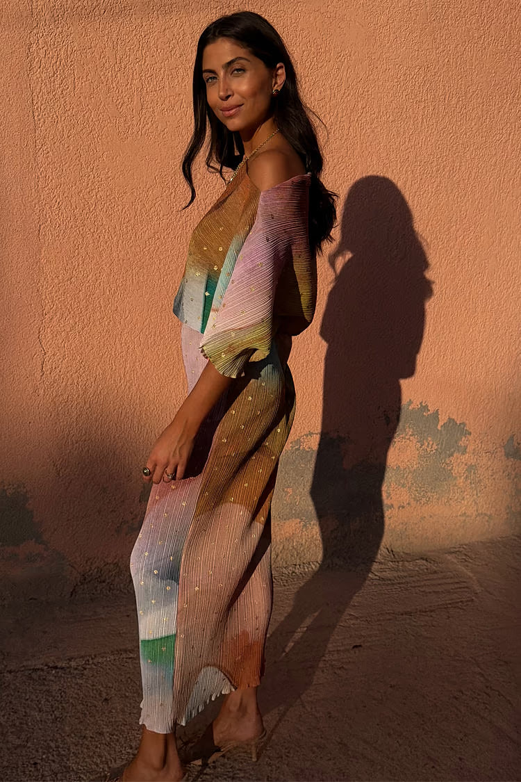 Designed in-house, our bestselling metallic fleck print featuring gold brushstrokes, that are highlighted by the sunlight, on a super chic...