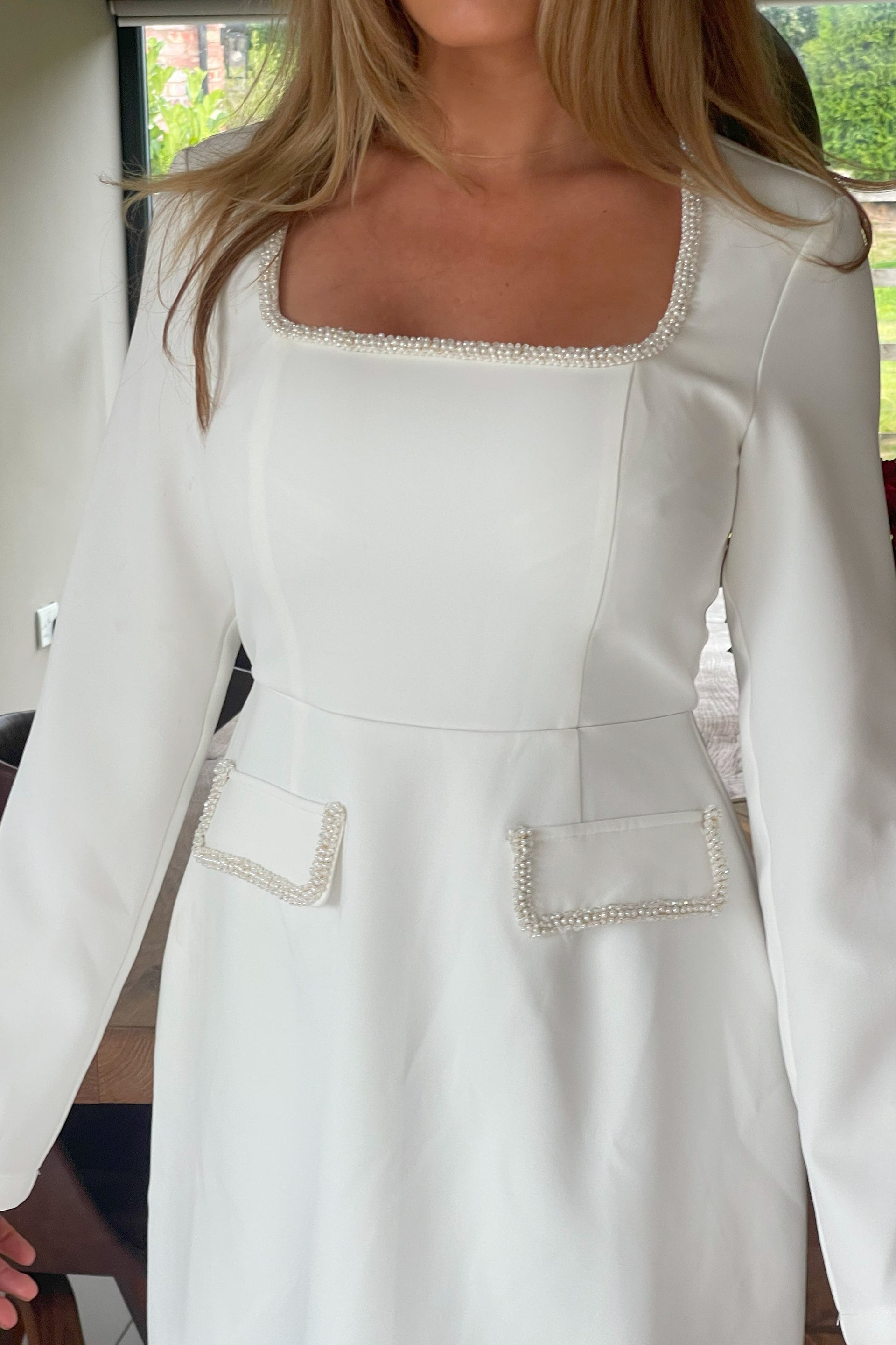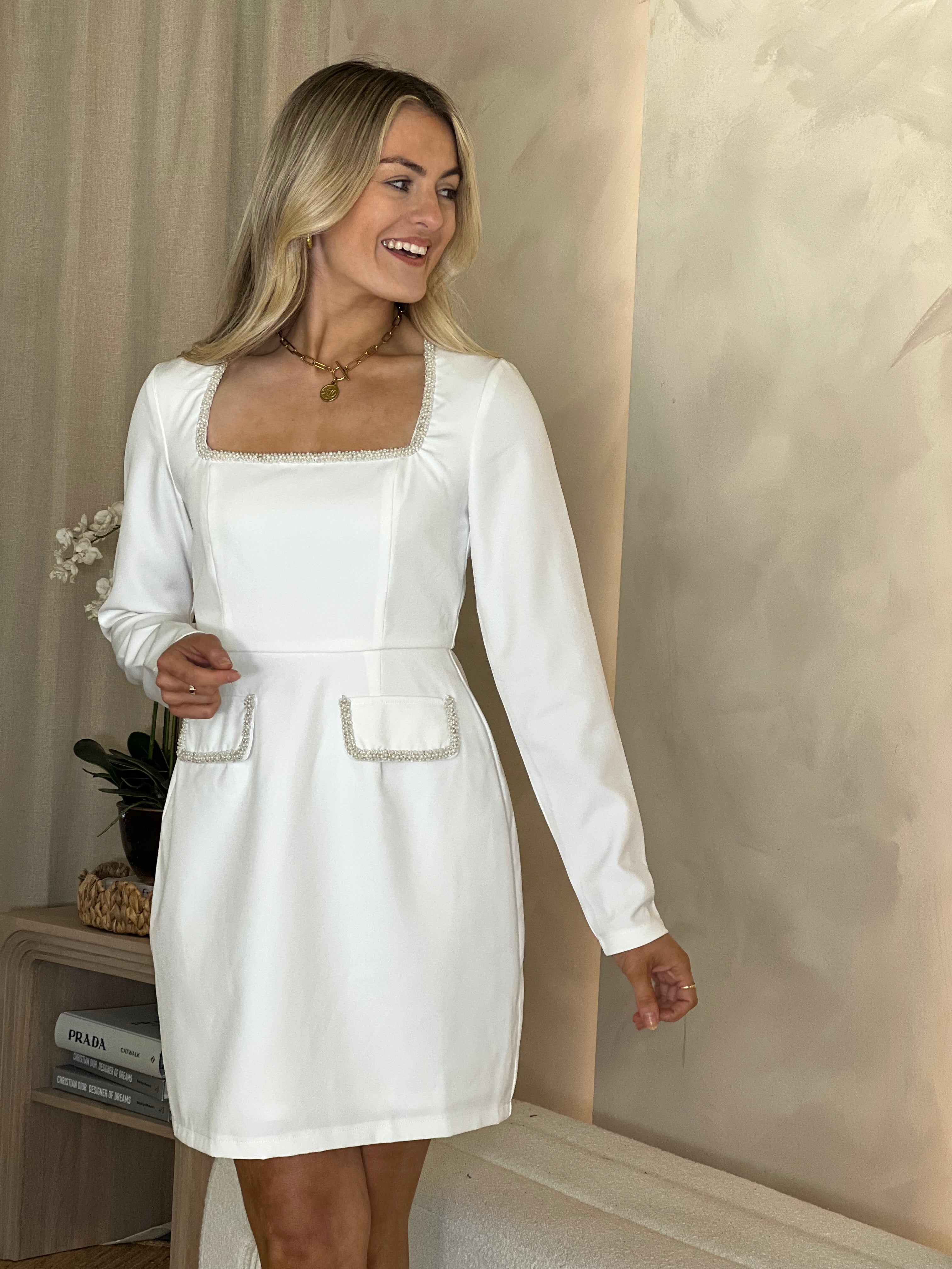 This sophisticated piece features a square neckline, playful mini length, and shimmering beaded fabric that adds a touch of glamour...