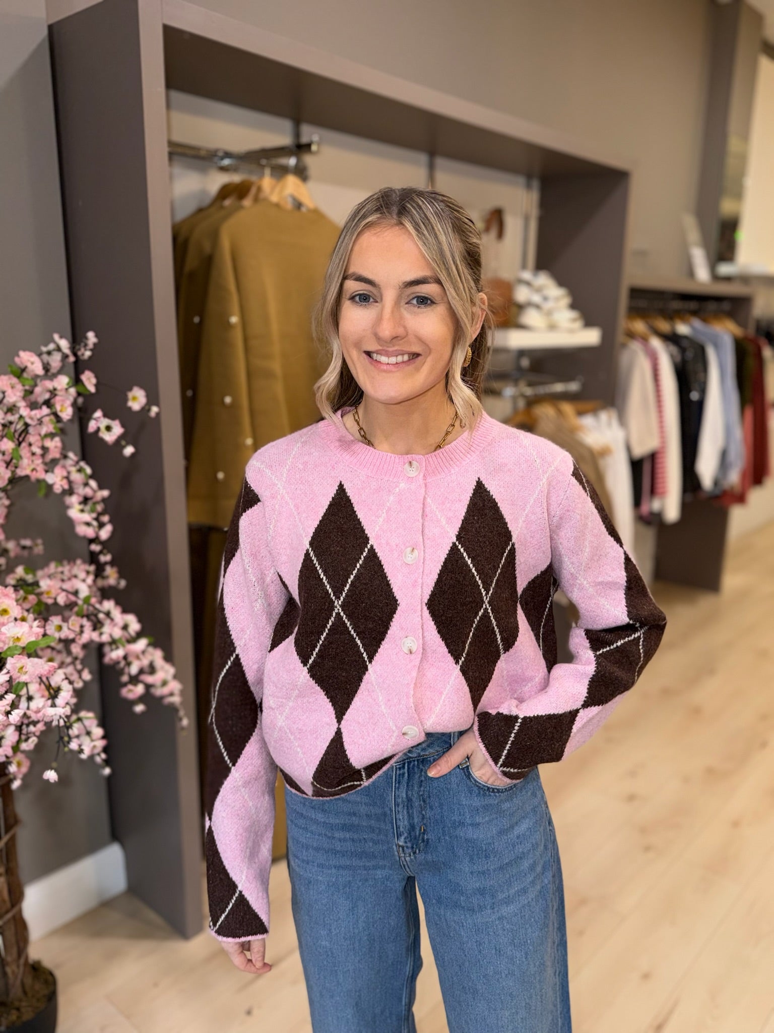 Wrap yourself in timeless elegance with this stunning argyle knit cardigan. Featuring a classic round neckline and eye-catching brown and...