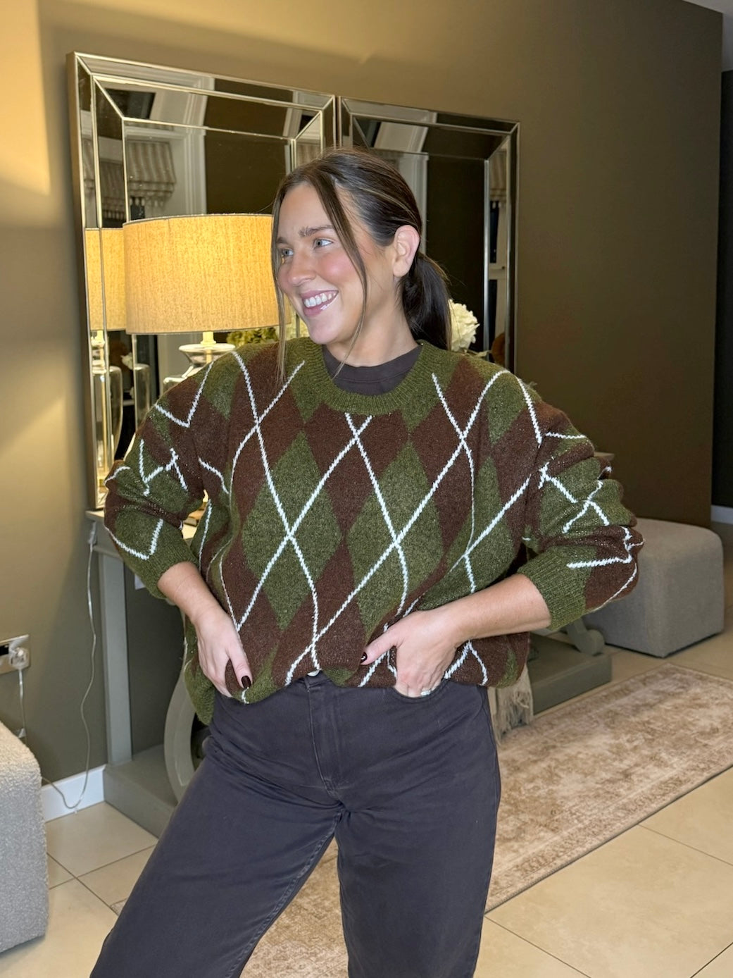 Elevate your everyday wardrobe with this striking Argyle Knit Sweater, where rich brown and verdant green create a sophisticated colour...