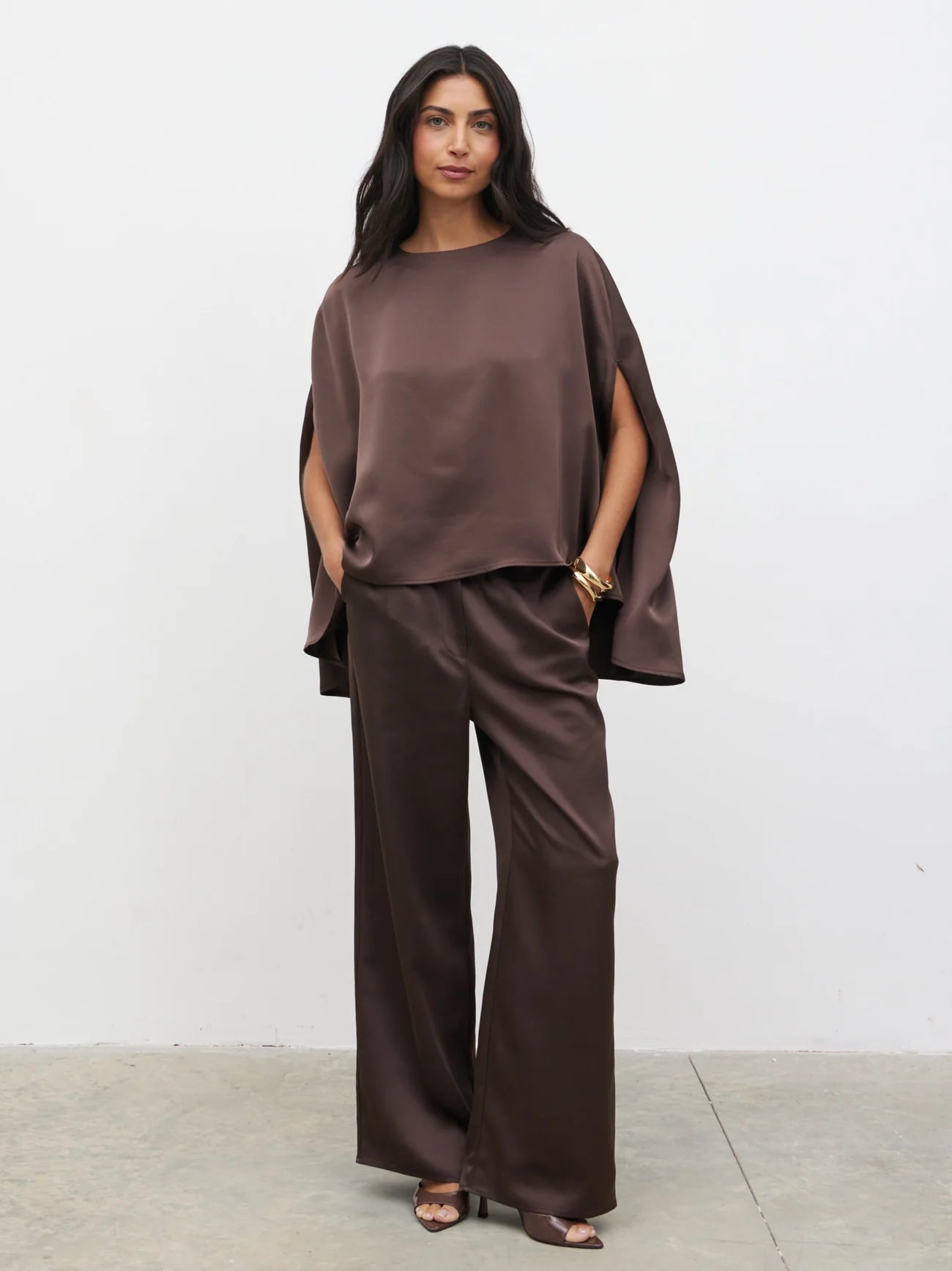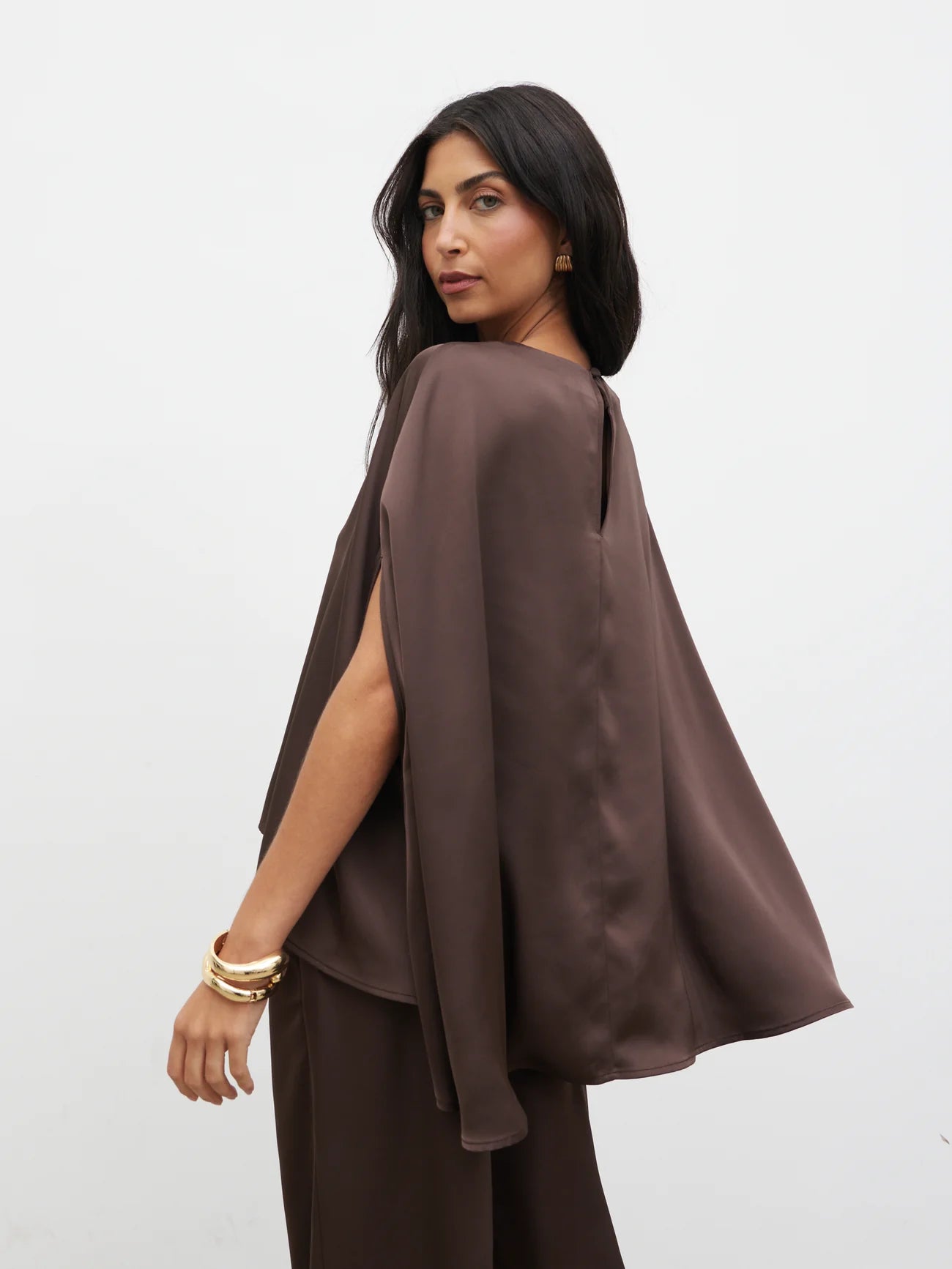 Floaty satin silhouette with cape sleeves Feminine and relaxed fit Luxe drape for evening wear Comfortable and chic
