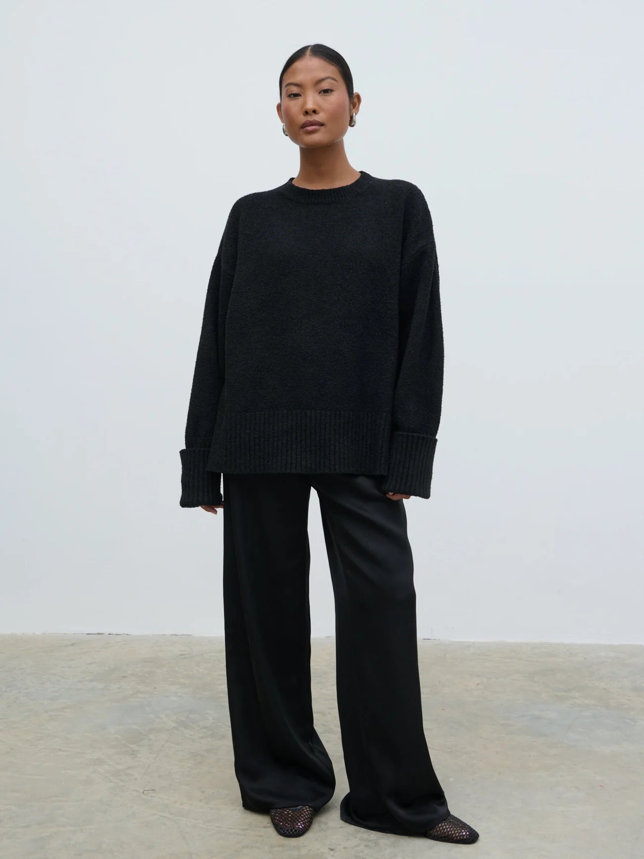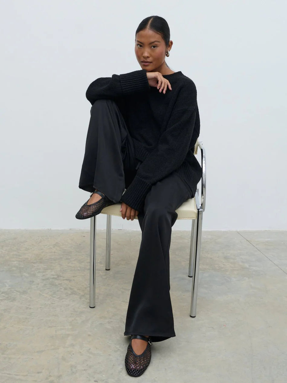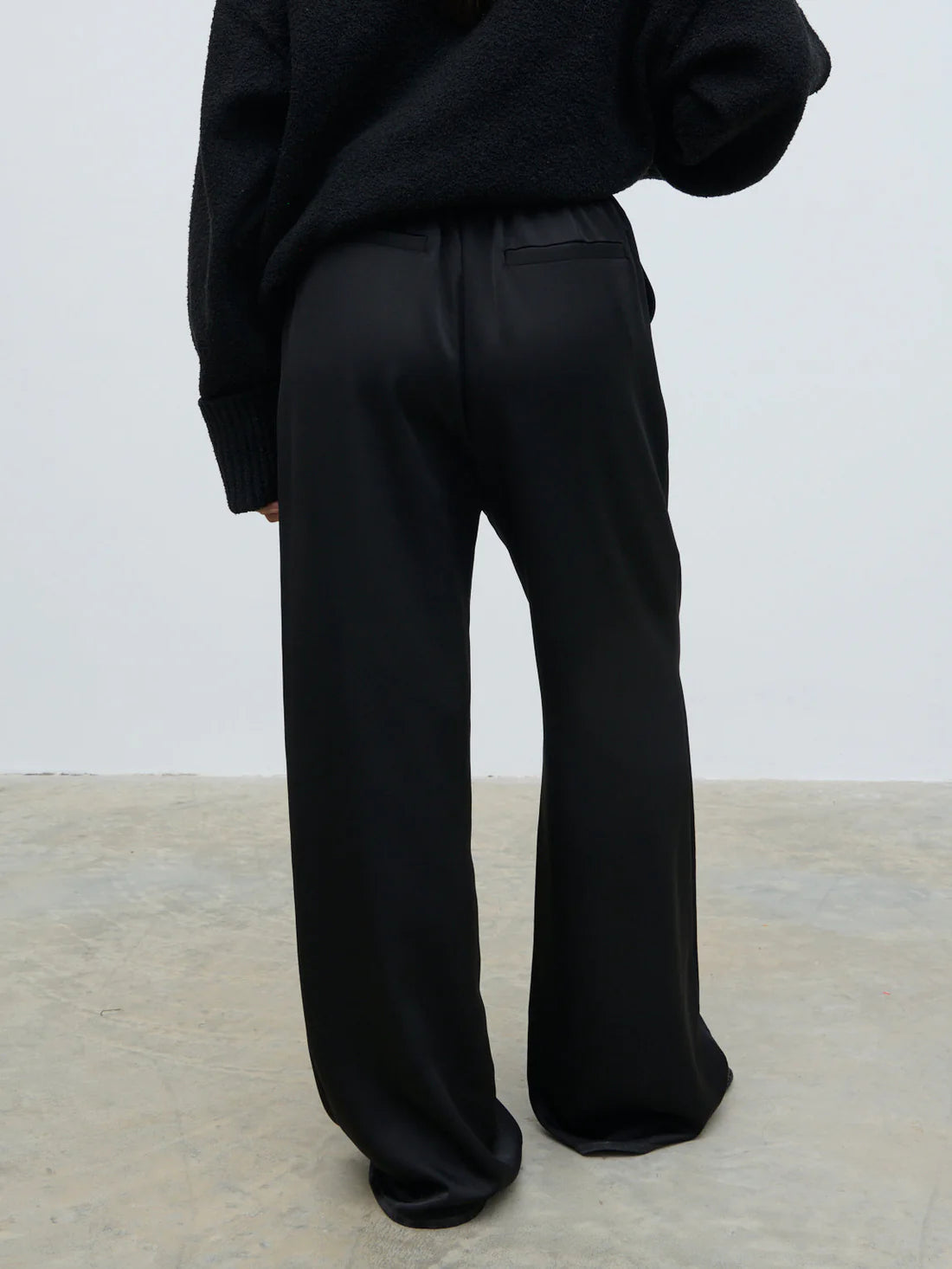 Premium satin Elasticated waist with draw cord Mock fly Functional side pockets Wide leg Full length