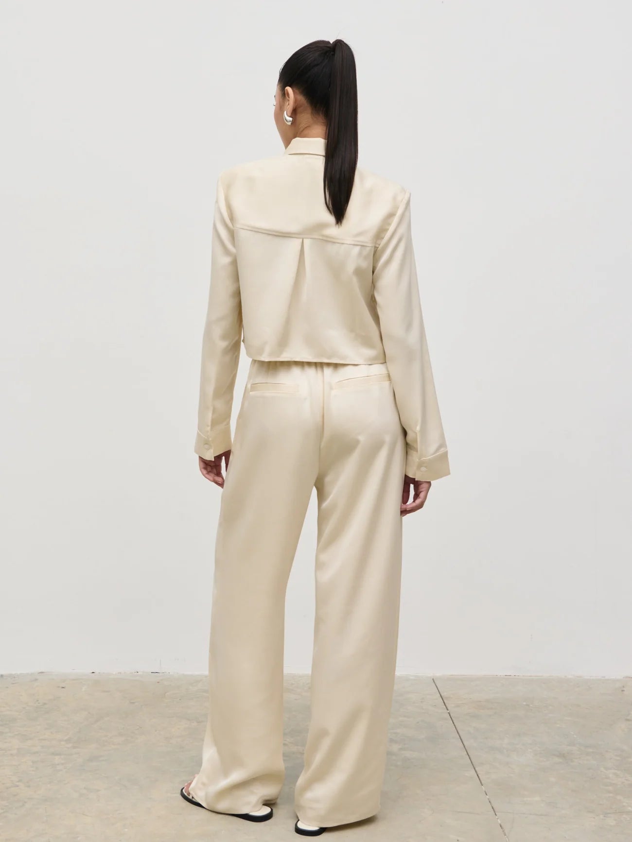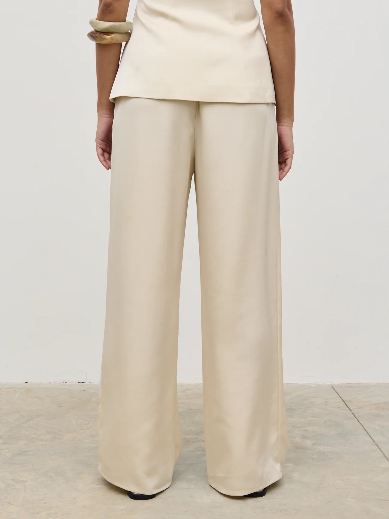 Premium satin Elasticated waist with draw cord Mock fly Functional side pockets Wide leg Full length