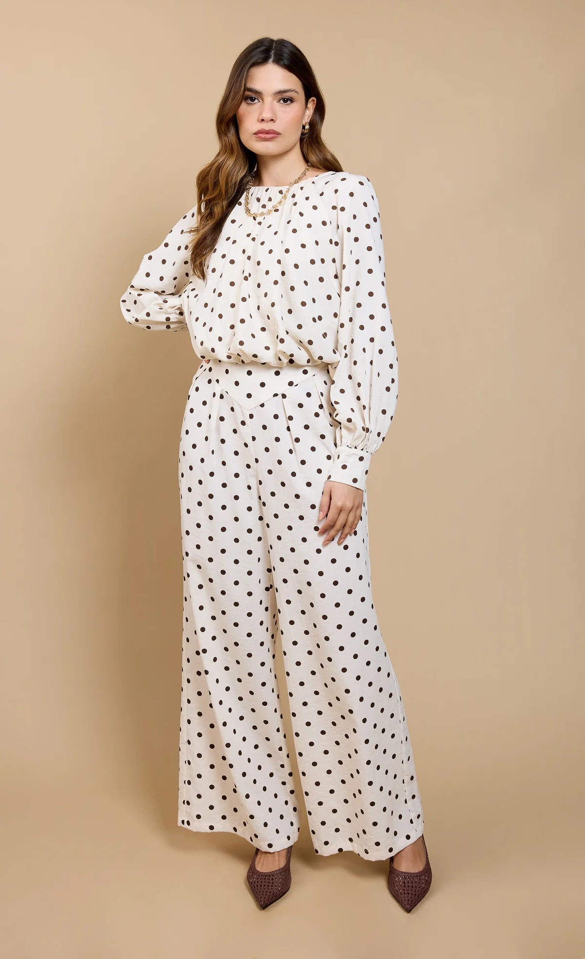 Step into effortless style with these cream polka dot wide leg trousers. Crafted from lightweight, flowing fabric with a flattering...