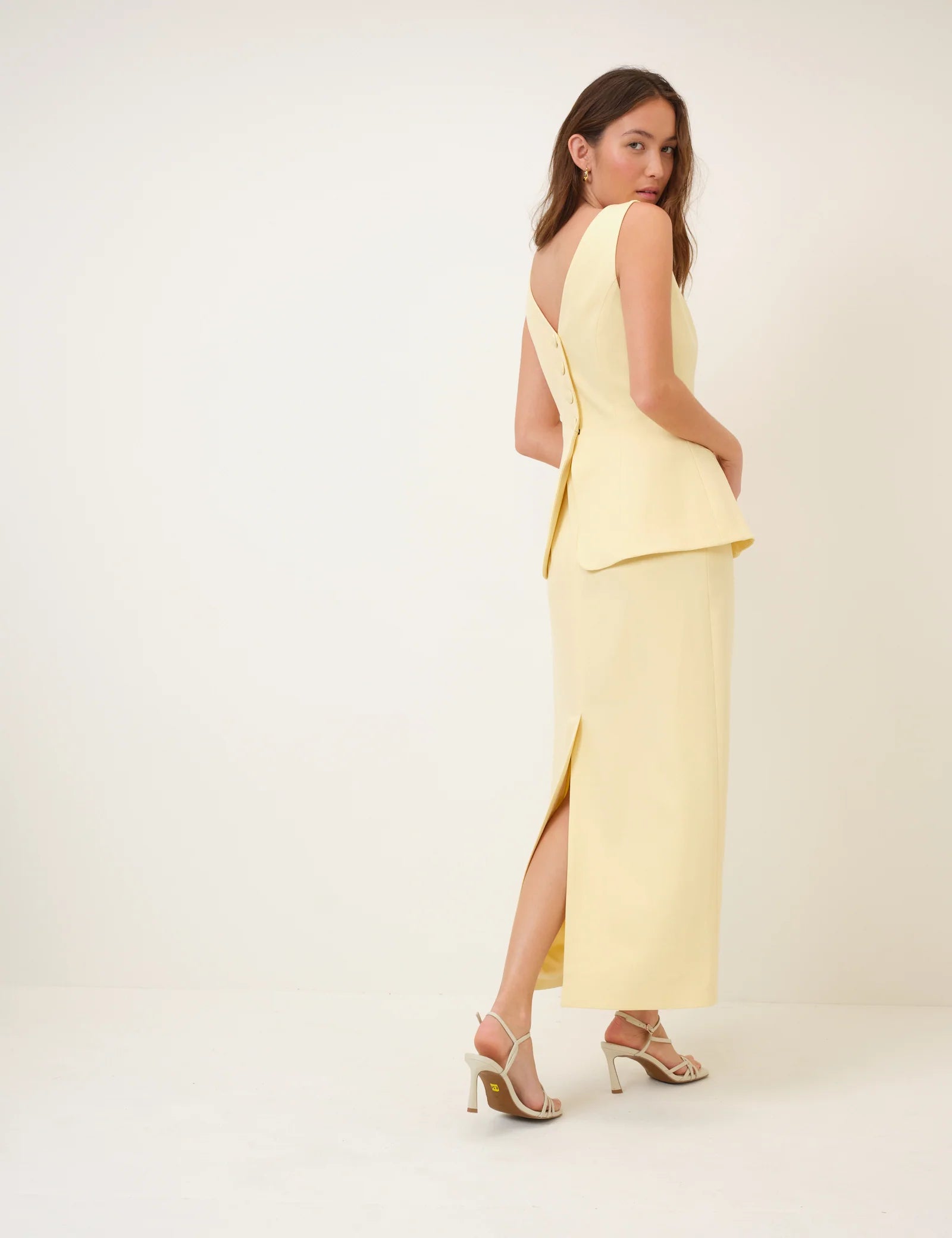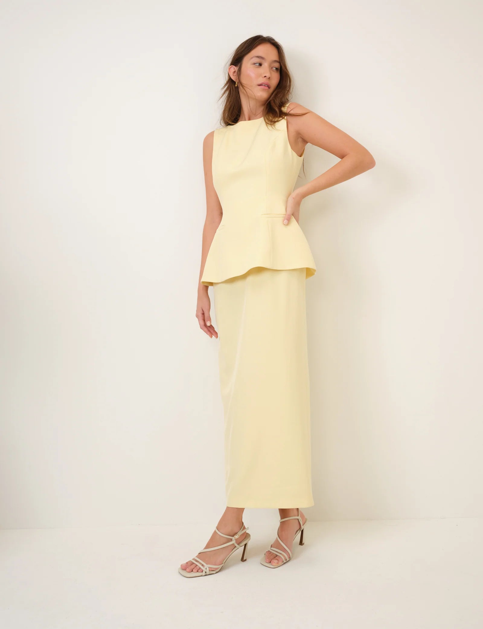 Boat neck Sleeveless Fit-and-flare bodice Non-functioning welt pockets V-back Back button-detailing Split hem Column skirt Back slit Lightly lined Size...