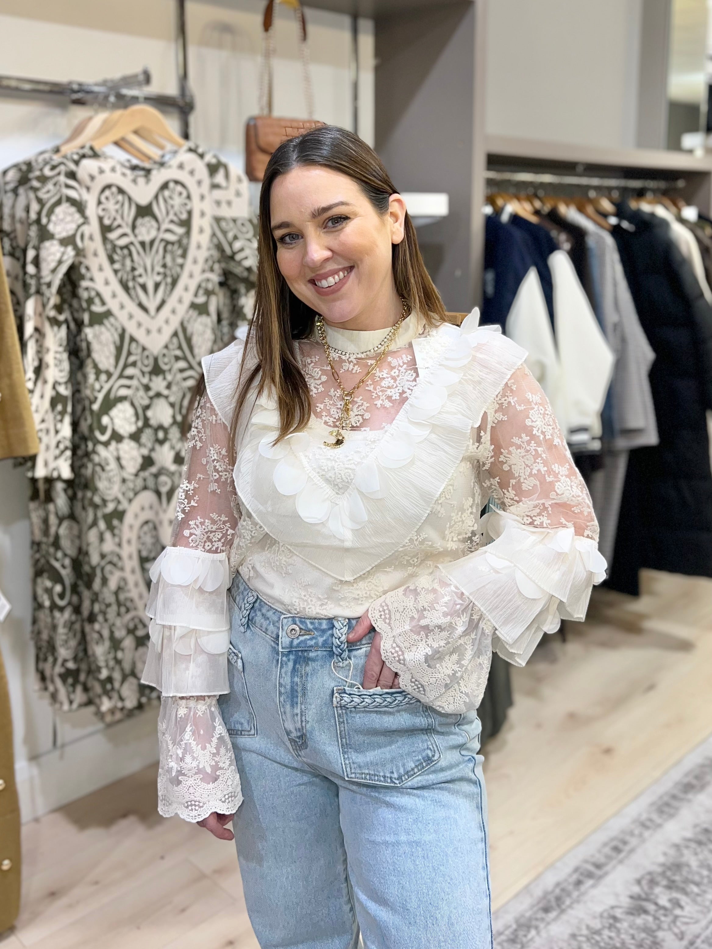 Elevate your wardrobe with this exquisite cream lace blouse, featuring delicate frill detailing and a refined high neckline. Long sleeves...