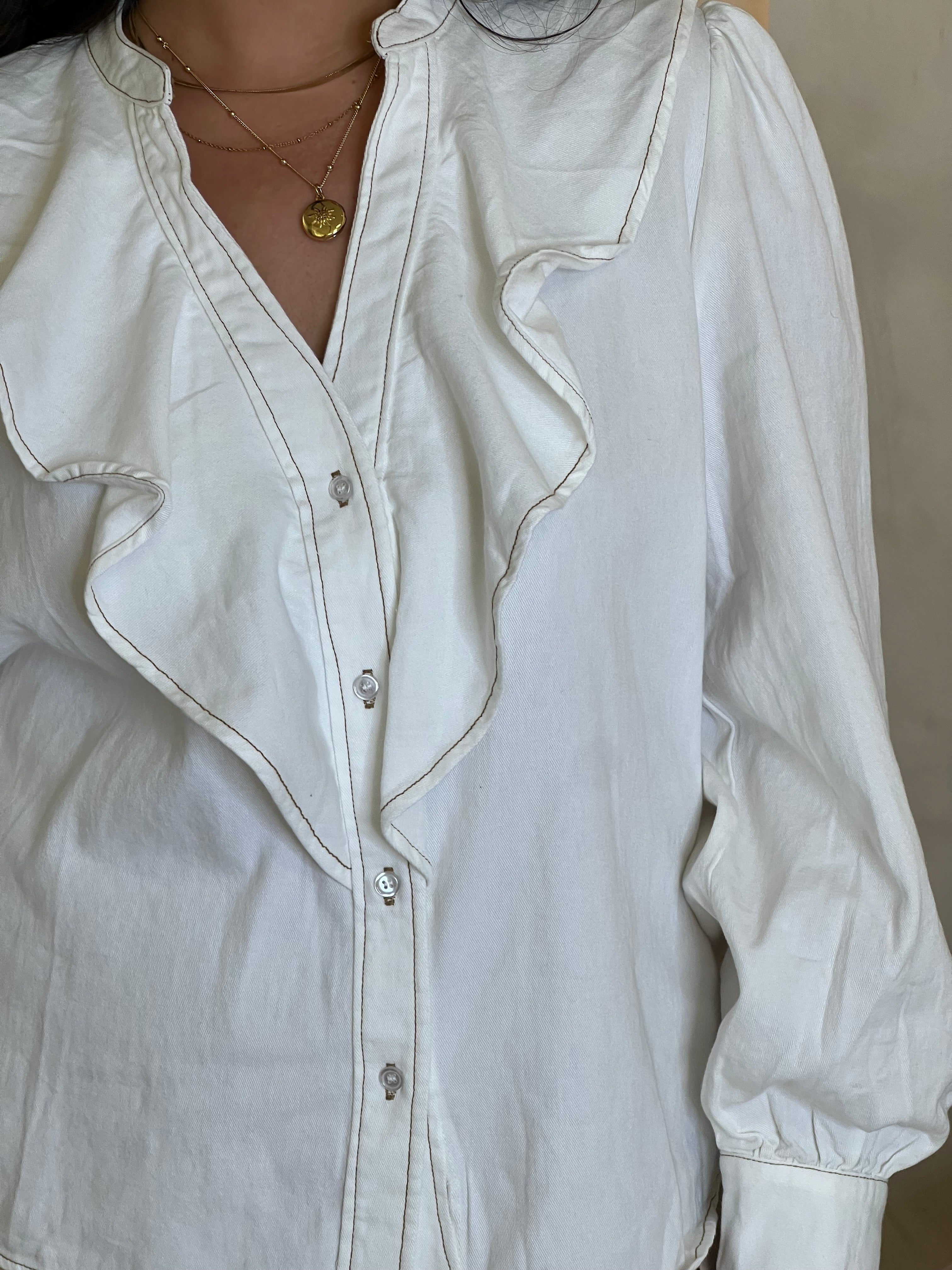 Embrace effortless style with the Frill Shirt. Made of lightweight denim, this relaxed fit shirt features a v-neck and charming...
