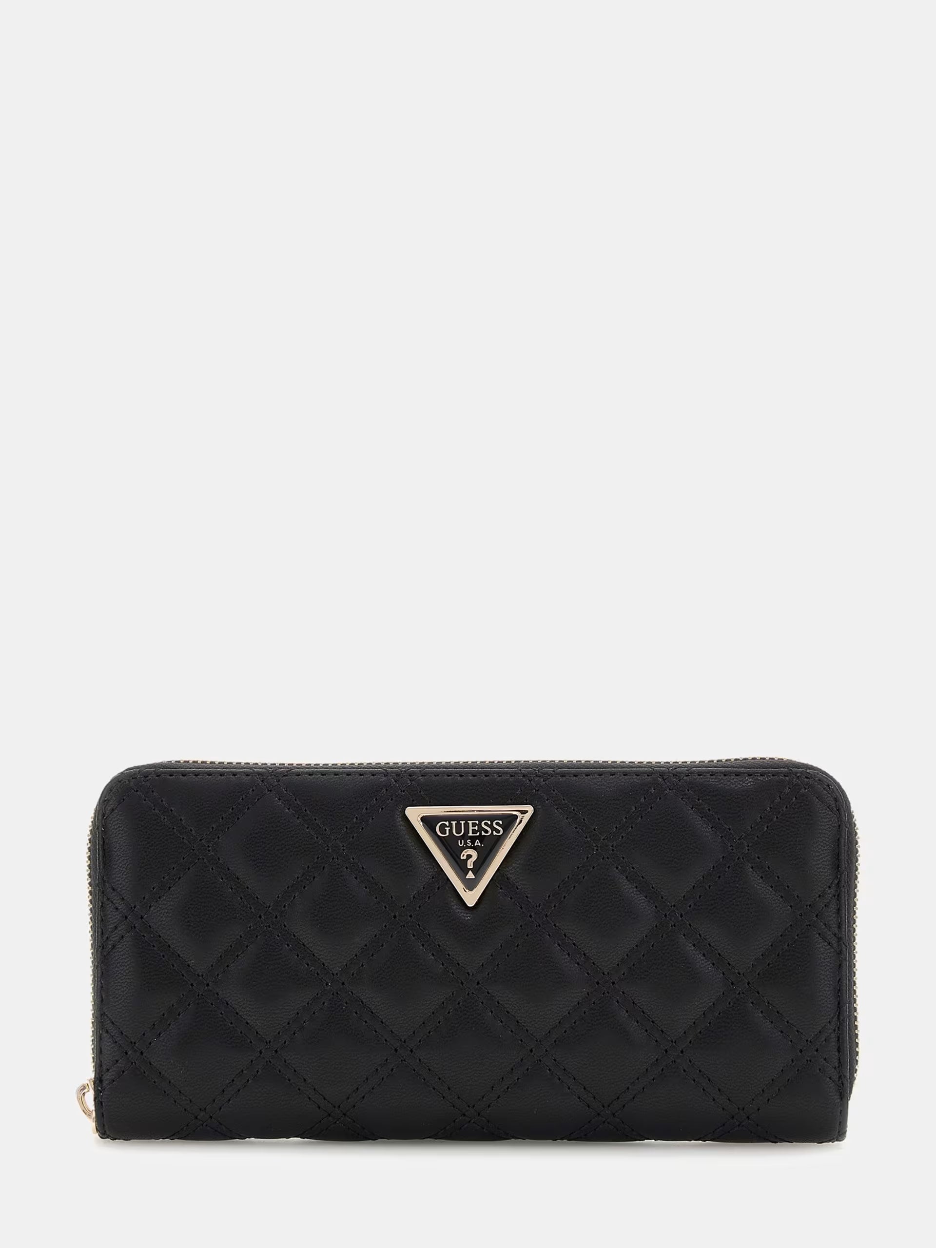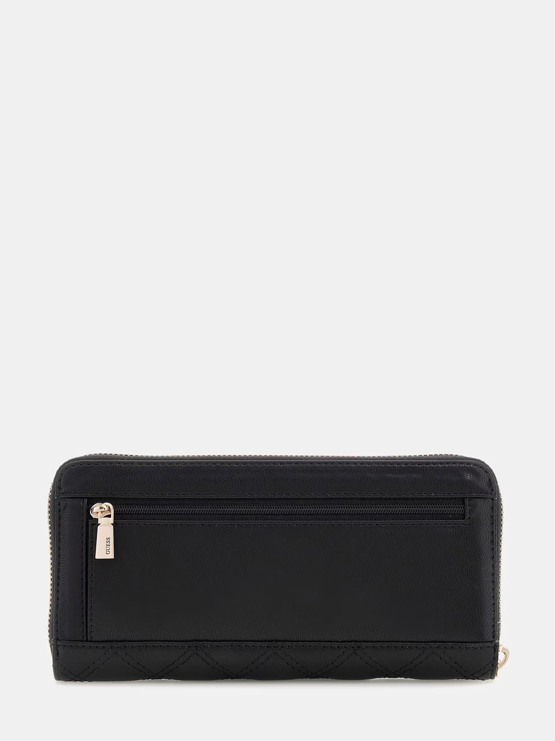 Quilted faux leather outer. Zip closure. Pale gold hardware. Family: Giully.Main compartment with pocket and internal coin purse; zip detail...