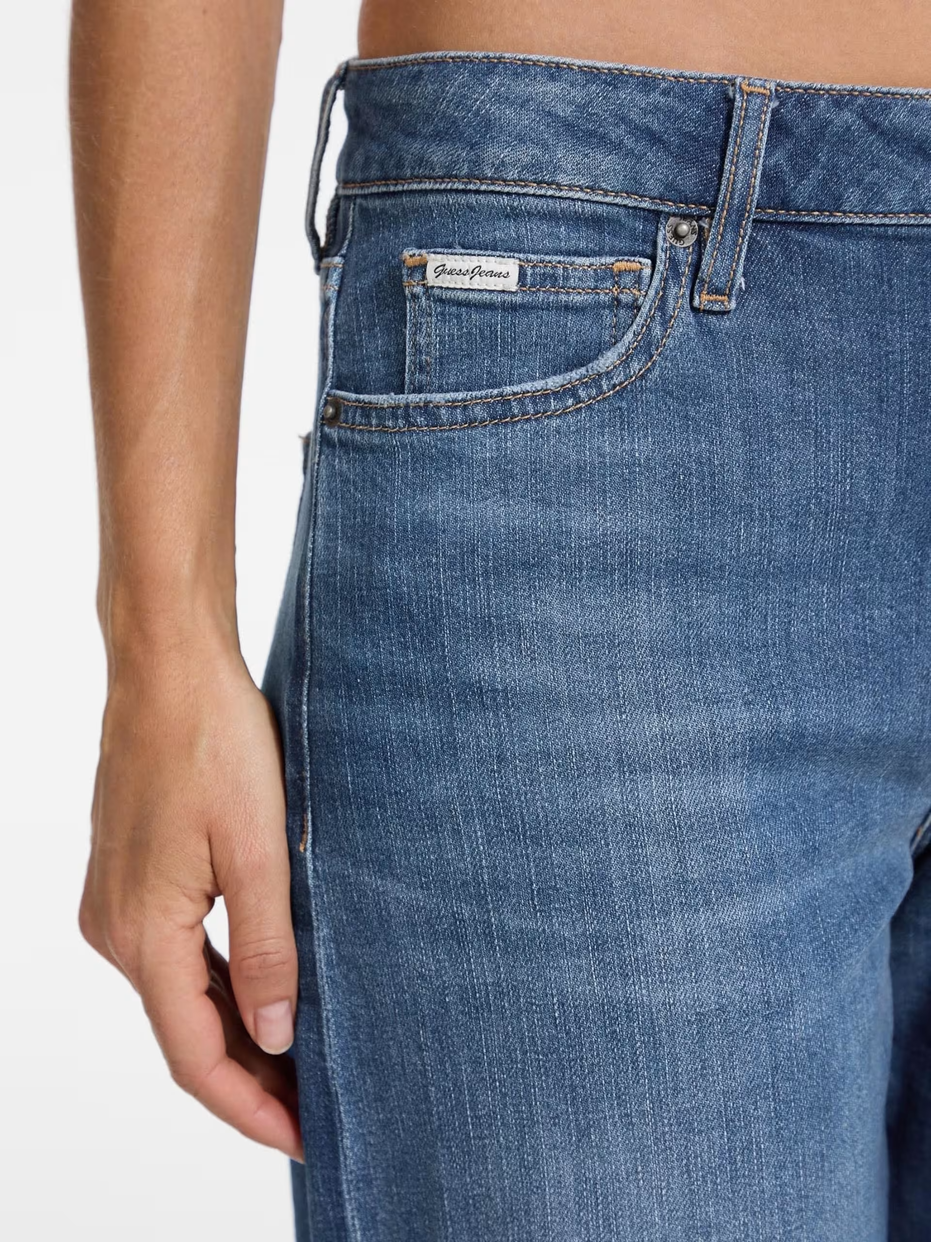 Stretch denim jeans in a medium wash. Five-pocket construction. Low rise and tapered Leg. Boyfriends style. Zip fly with button...