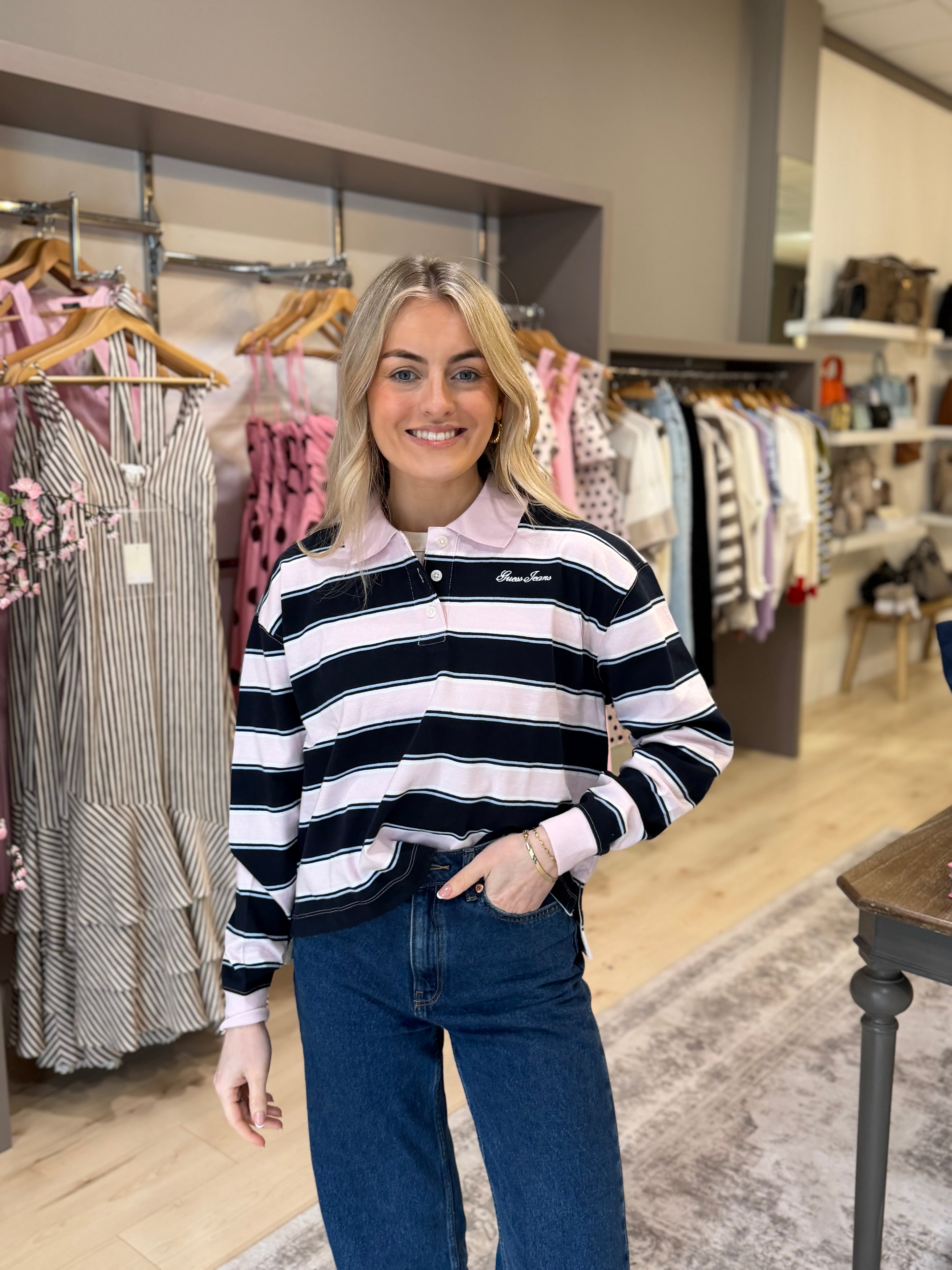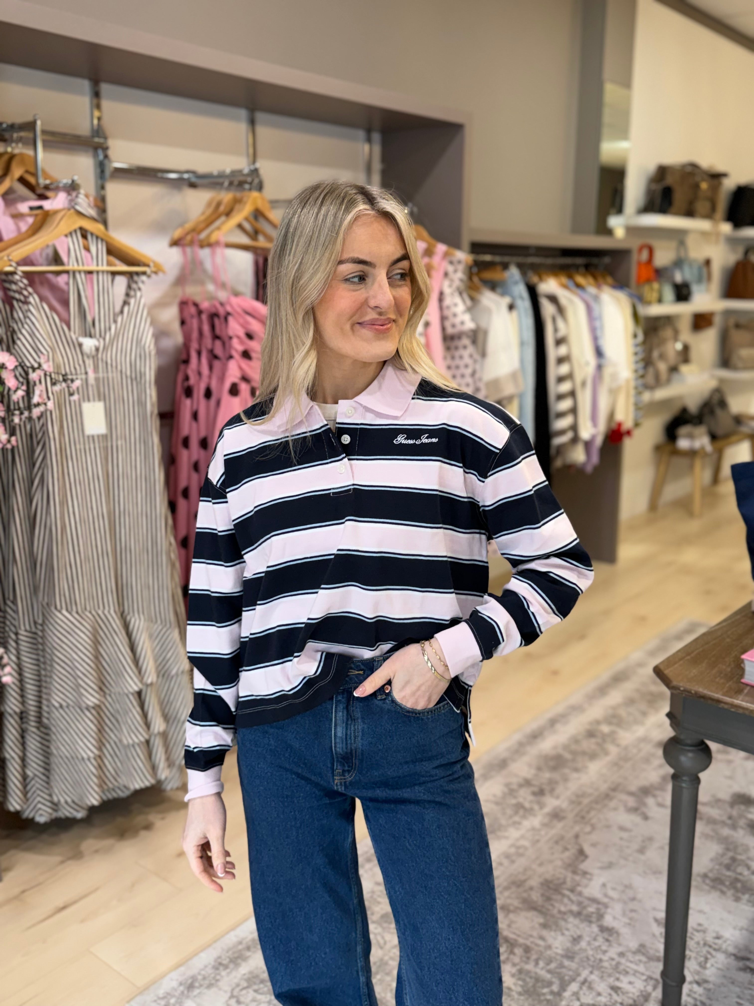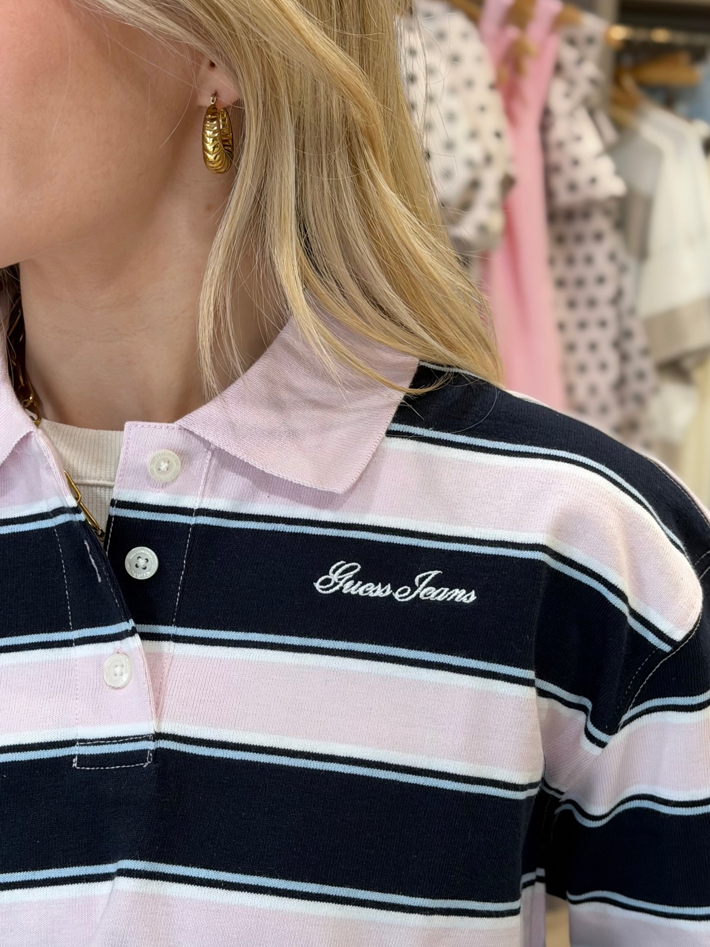 Guess Jeans Stripe Crop Polo Shirt - Navy/Pink