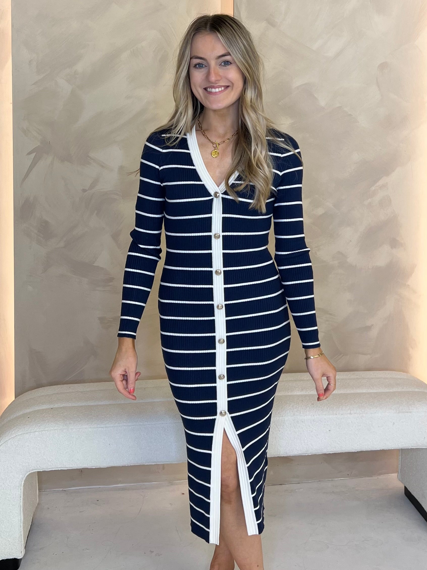 Elevate your wardrobe with the Guess Striped Andrea Midi Dress in navy and white. This ribbed knit dress features a...