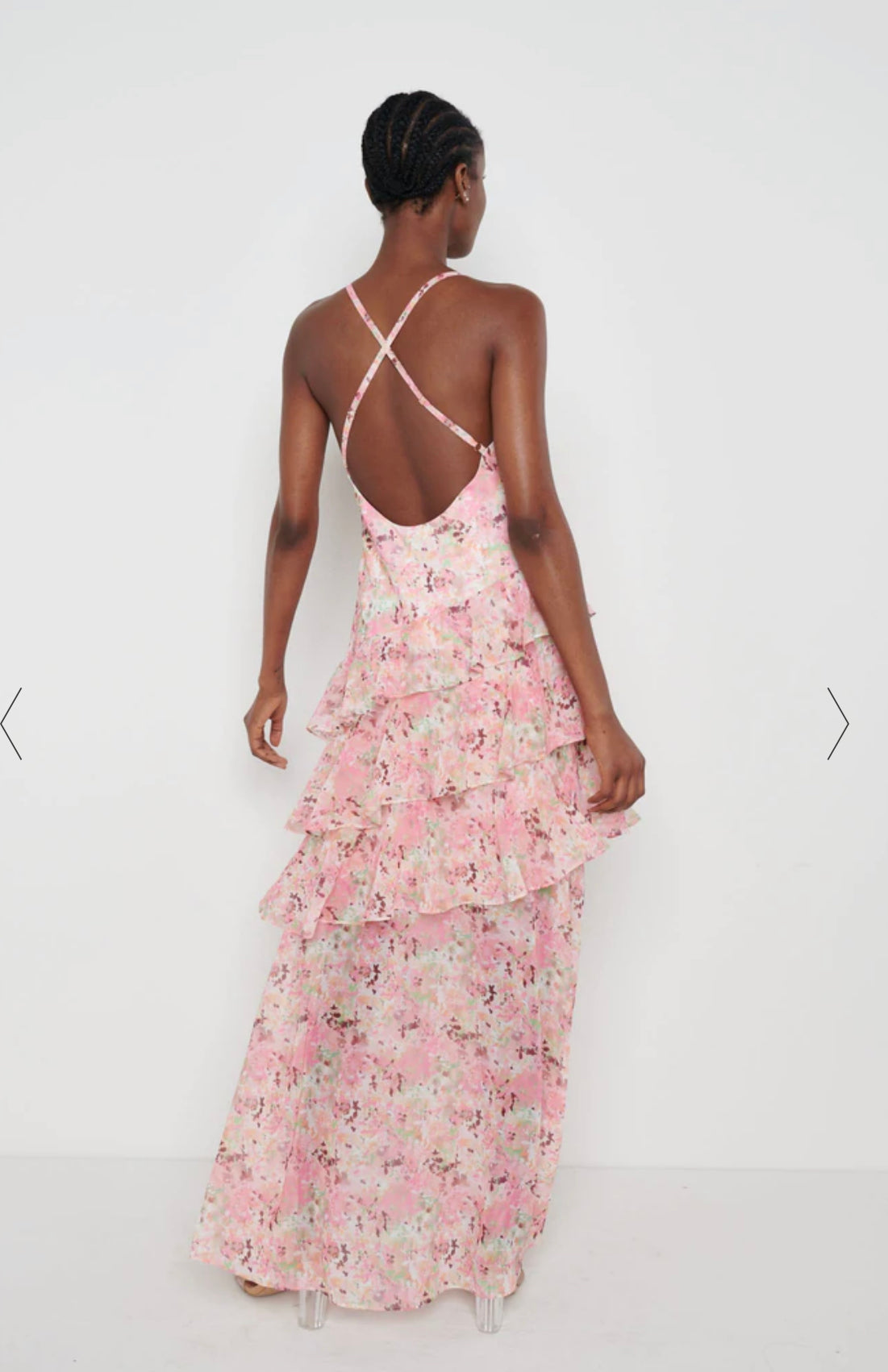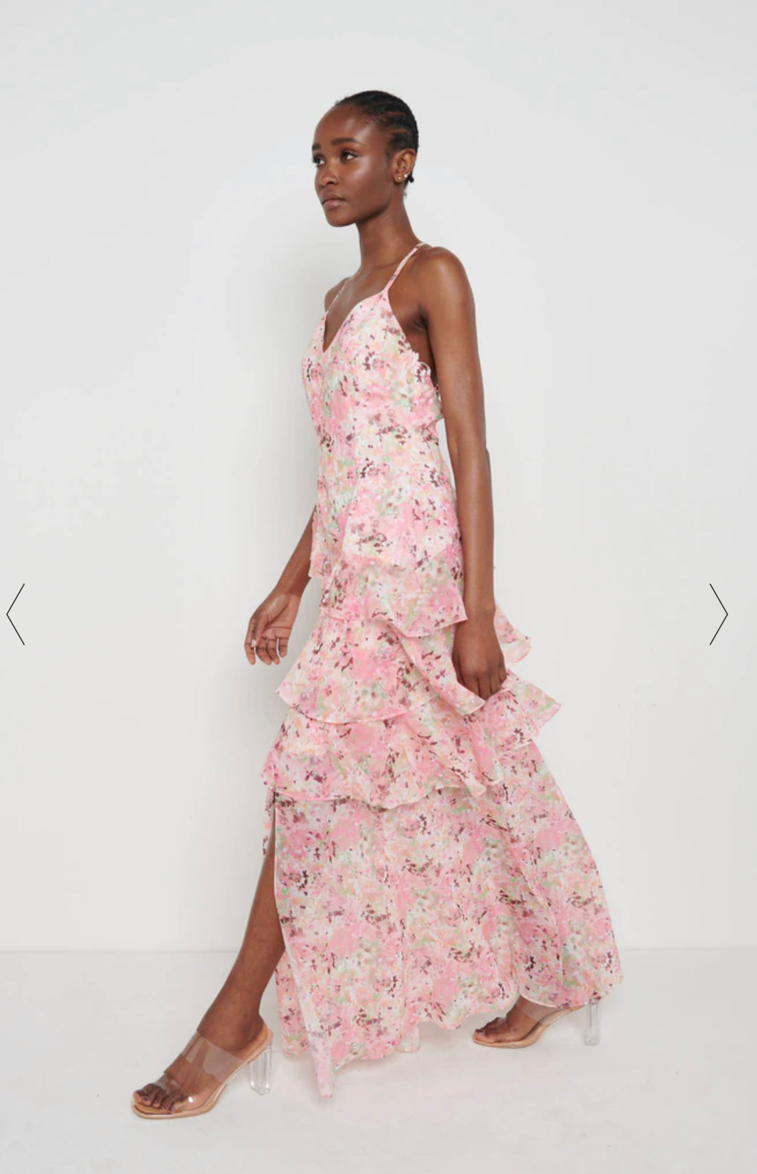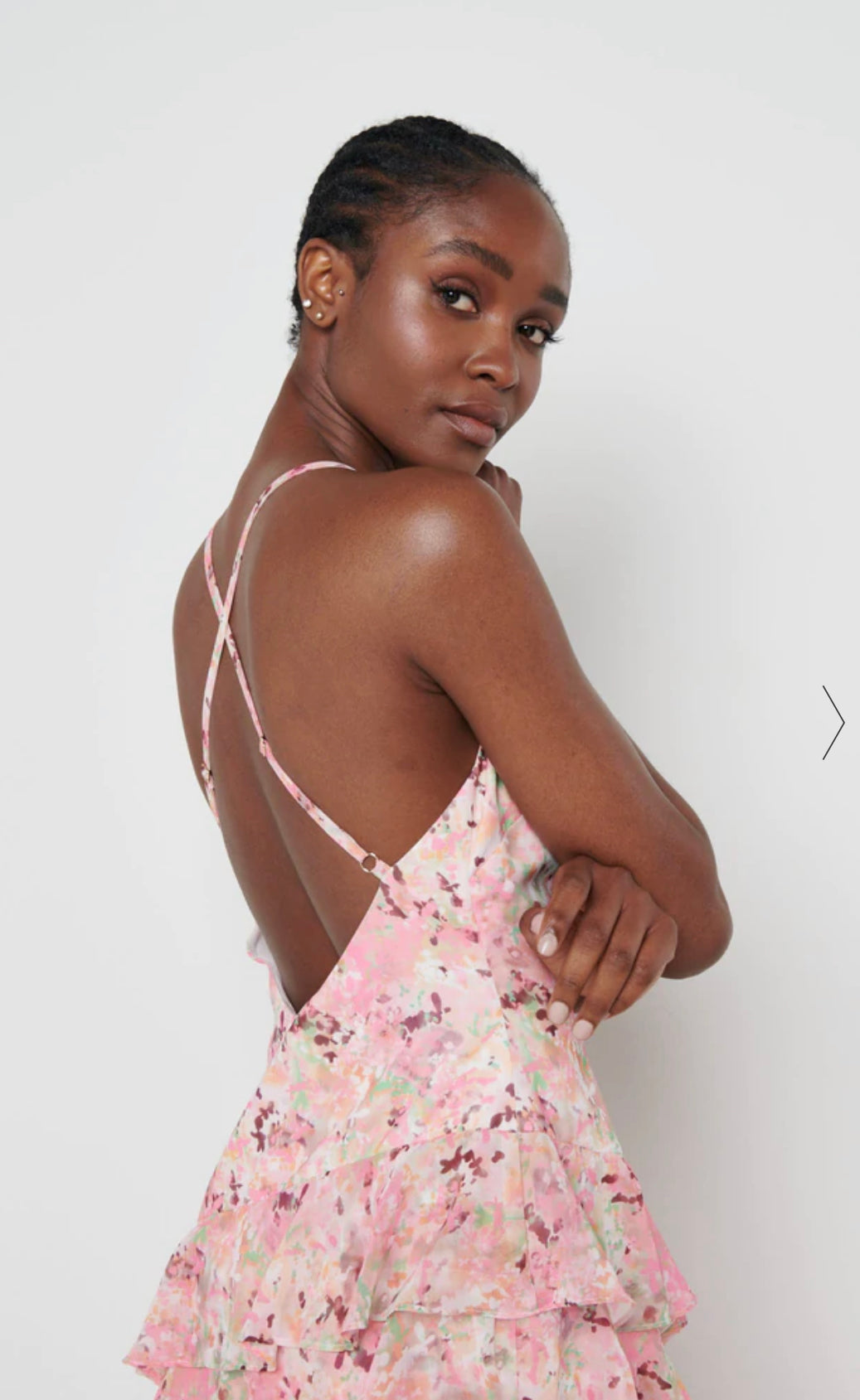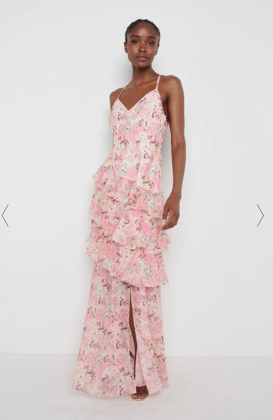 •Lightweight chiffon (100% polyester) •Plunge V-neck •cascading ruffles •Side Slit •Cross back details •Adjustable Cami straps