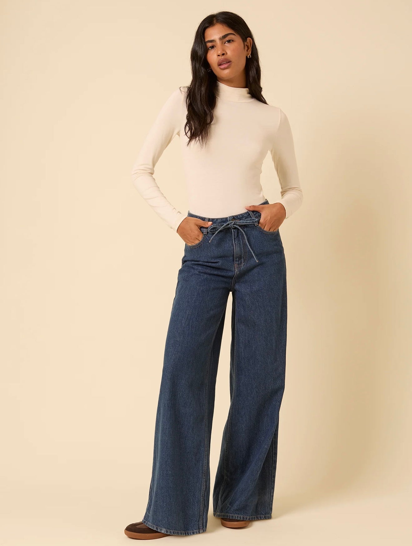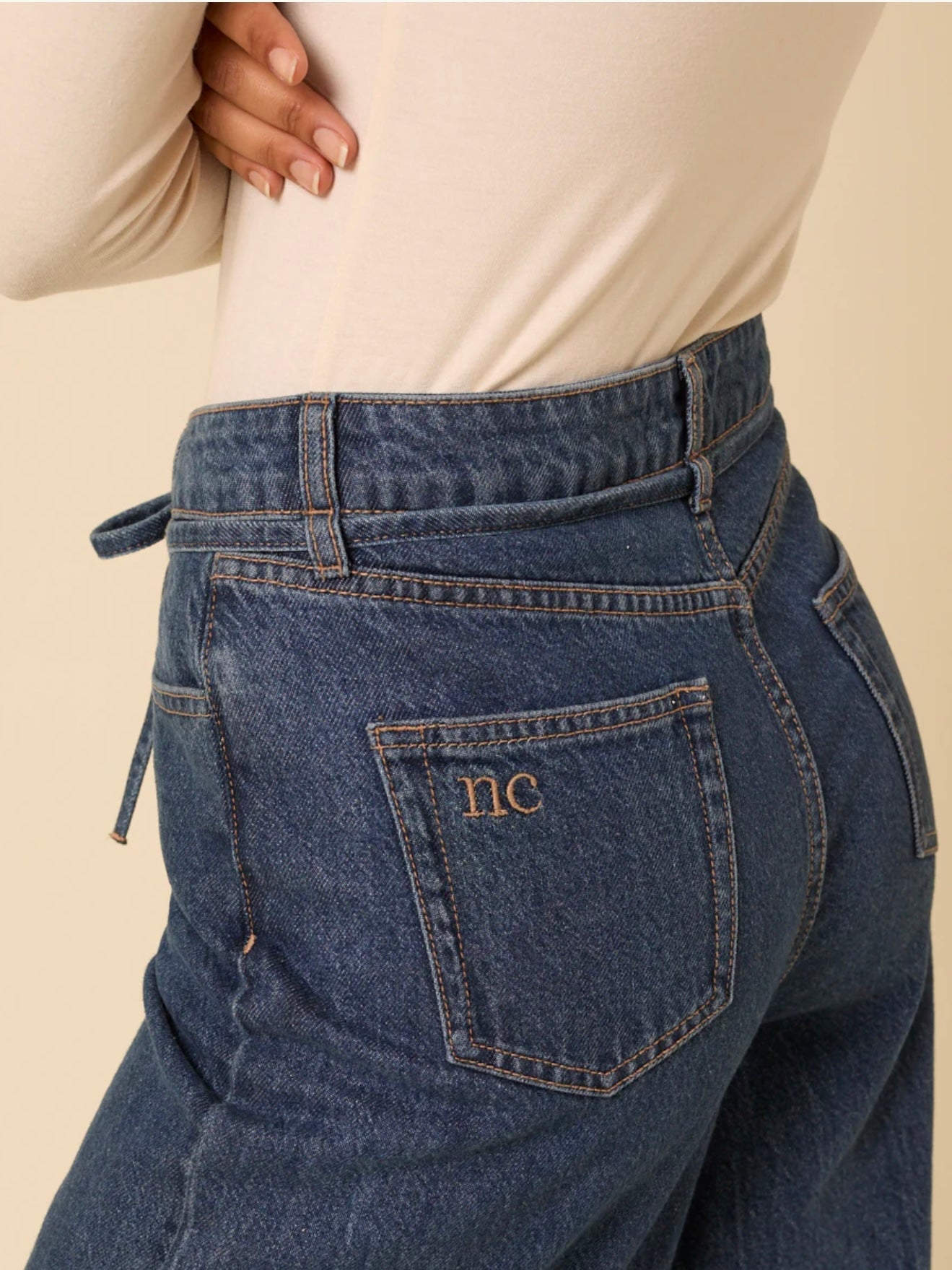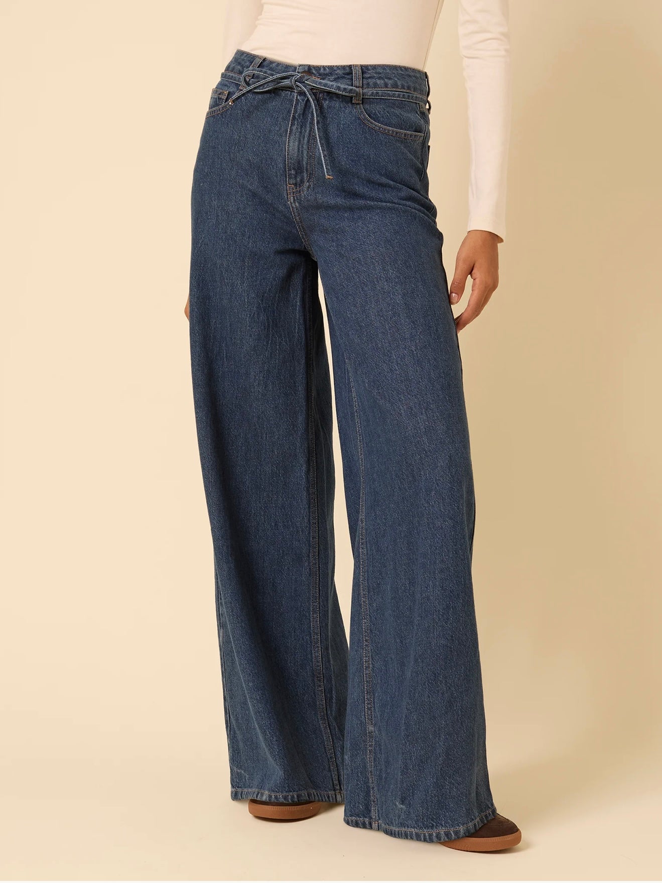 High Rise Tie Waist Wide Leg Jeans - Dark Blue