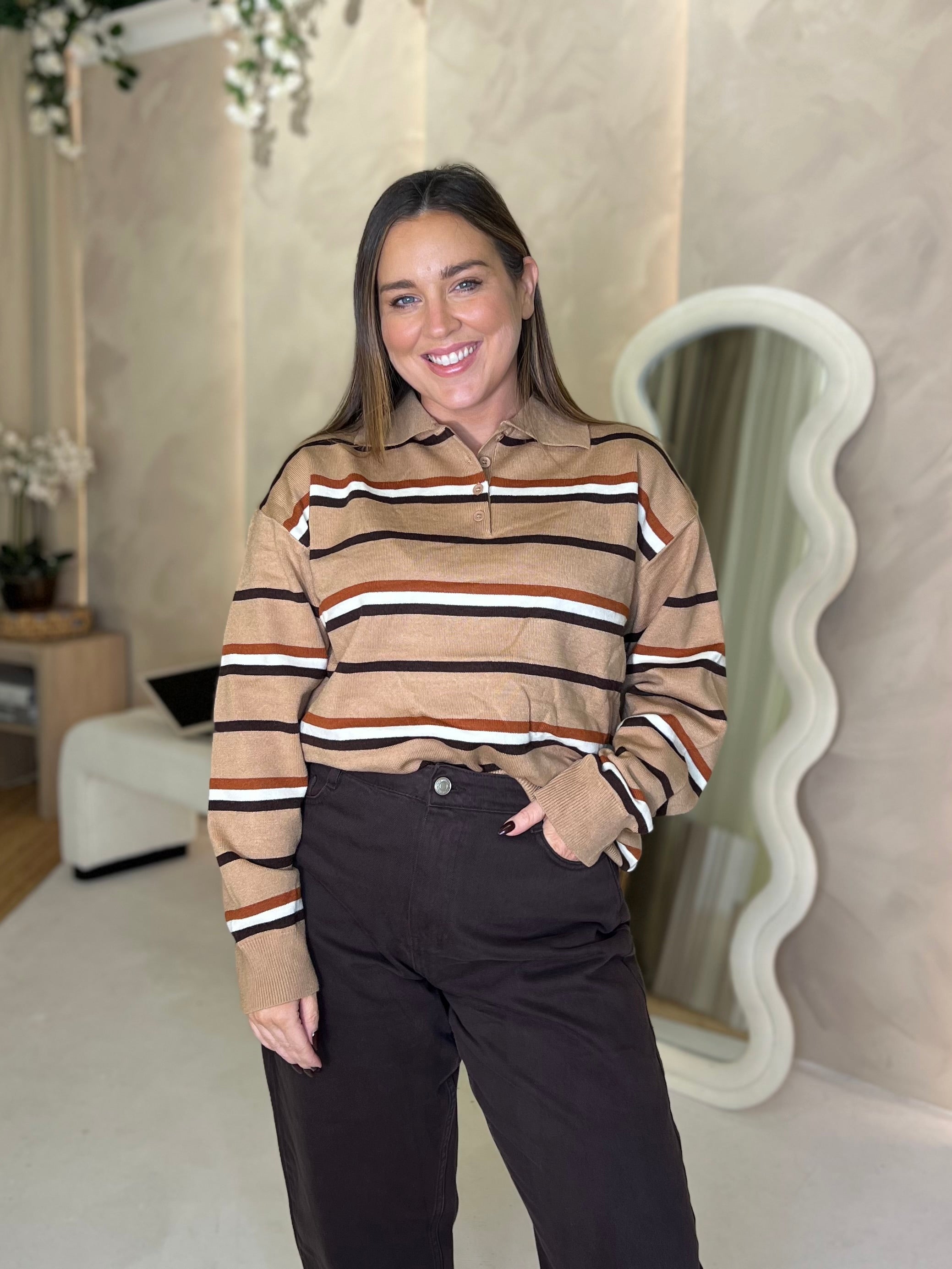 Elevate your casual wardrobe with this striking Knit Rugby Top in warm camel and caramel tones. Crafted from a substantial...
