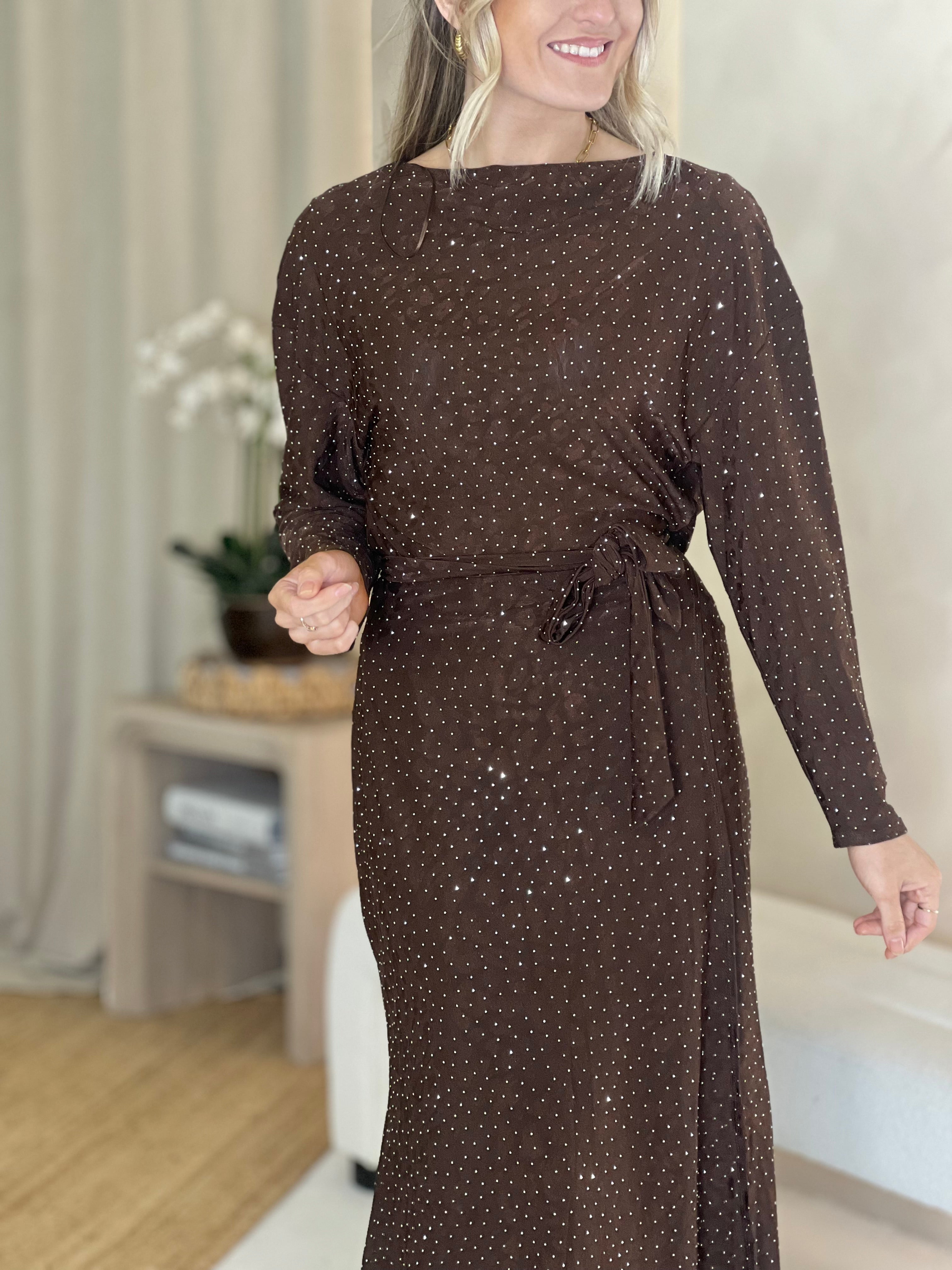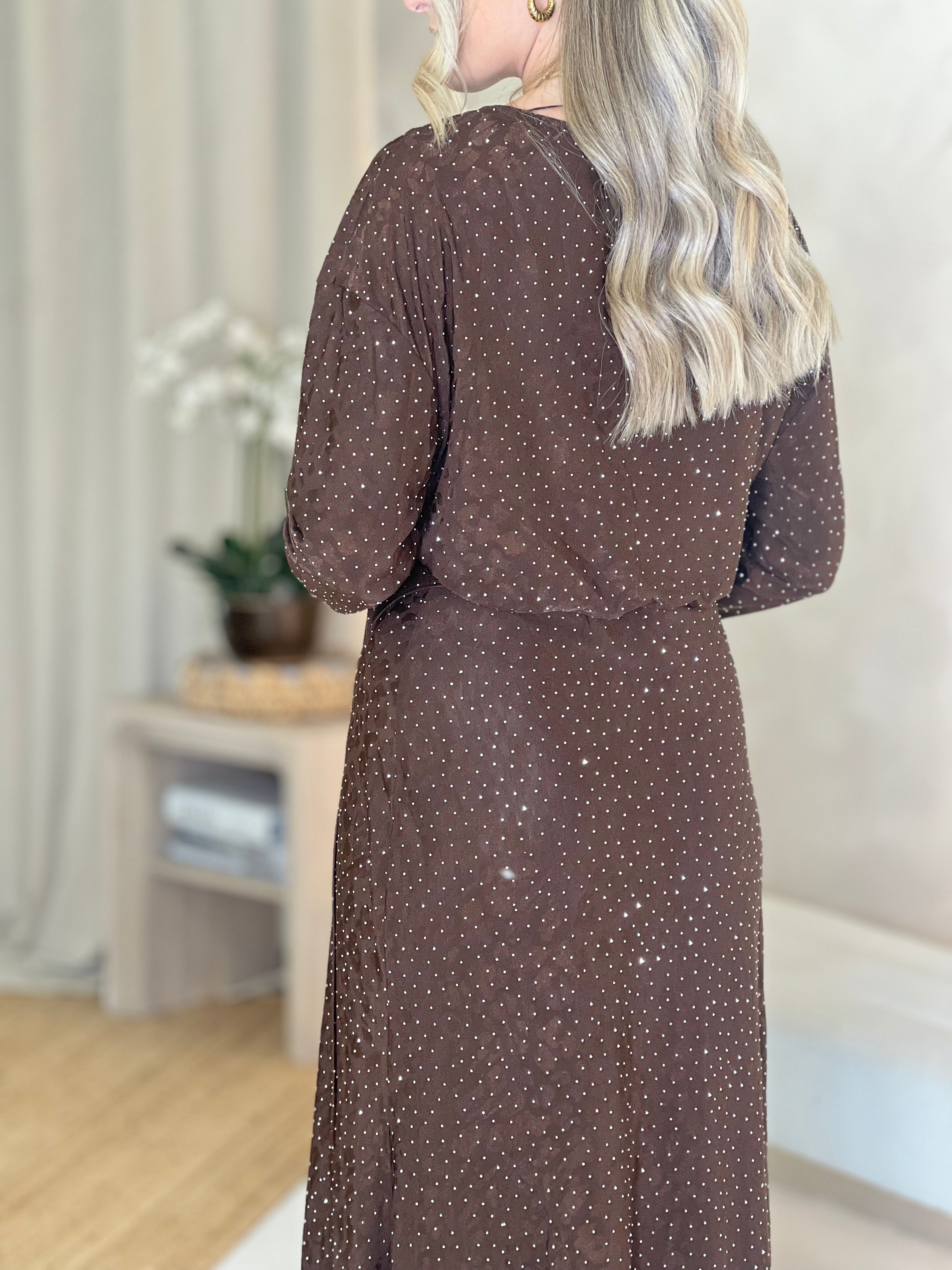 Elevate your evening look with this chocolate-toned midaxi dress, featuring a bold animal texture and a shimmering gem wrap detail...