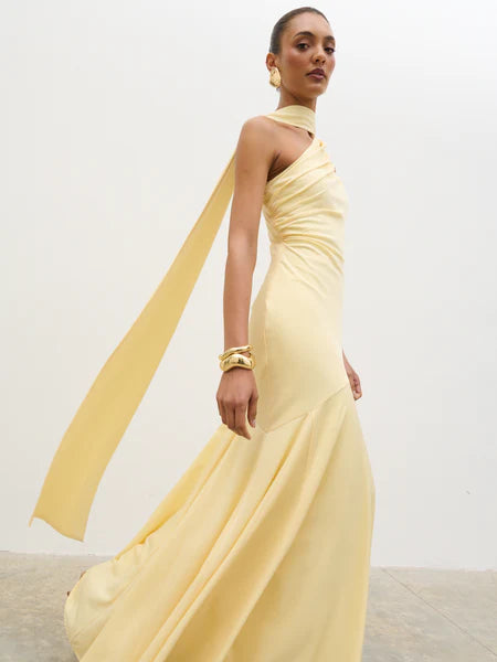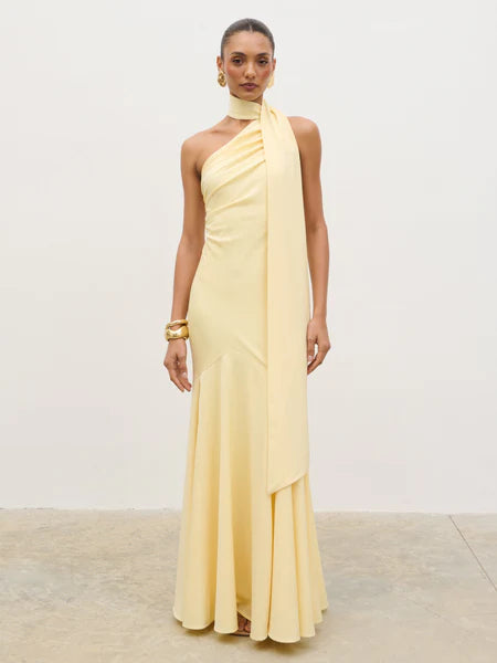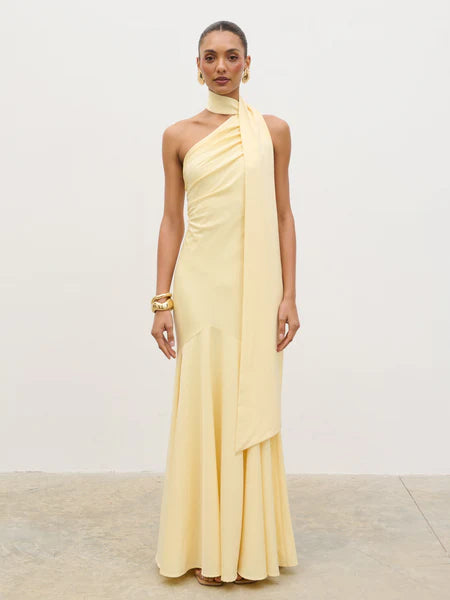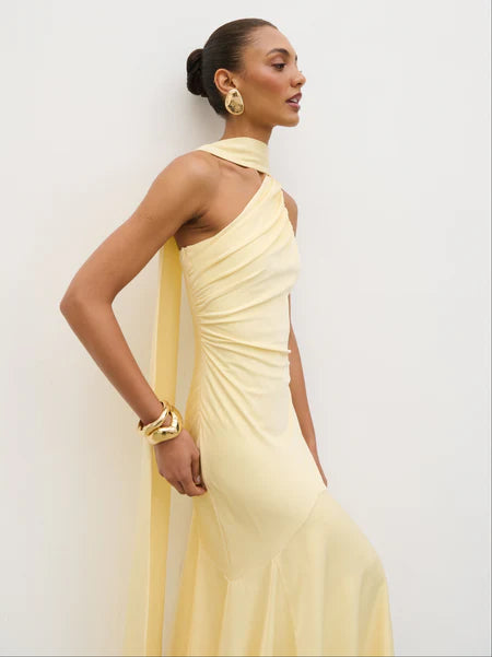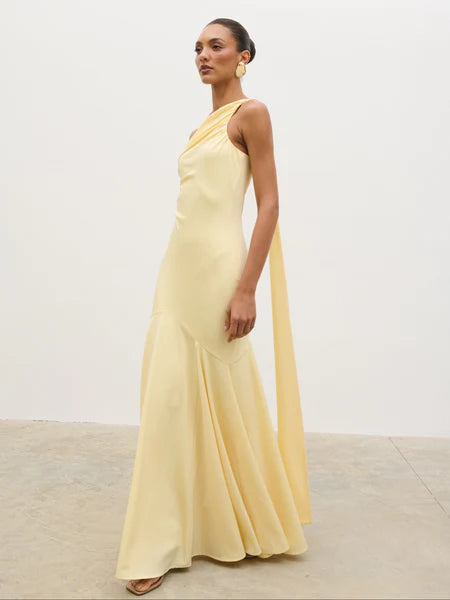 Porto One Shoulder Godet Maxi Dress - Lemon
