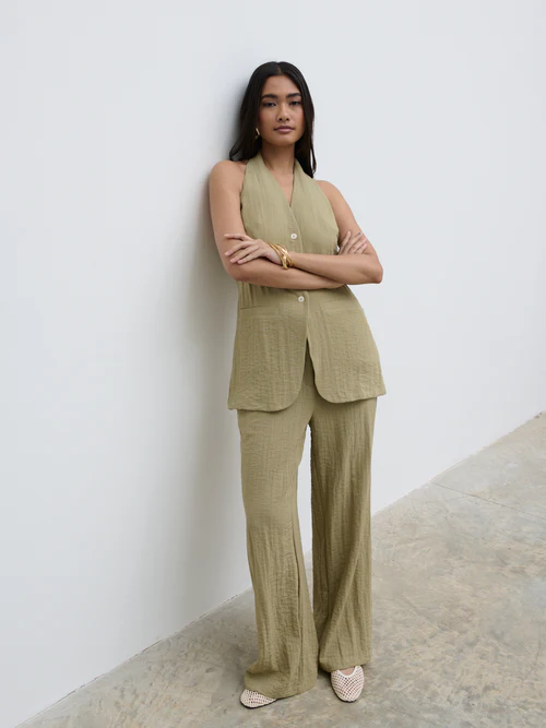 Halterneck design Button front Long line design Welt pocket detail Elasticated along back edge Composition Main 77% Viscose 23%...