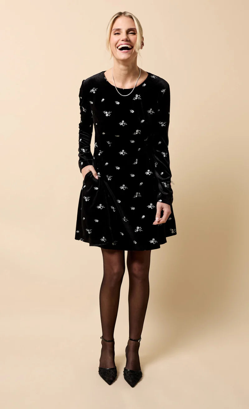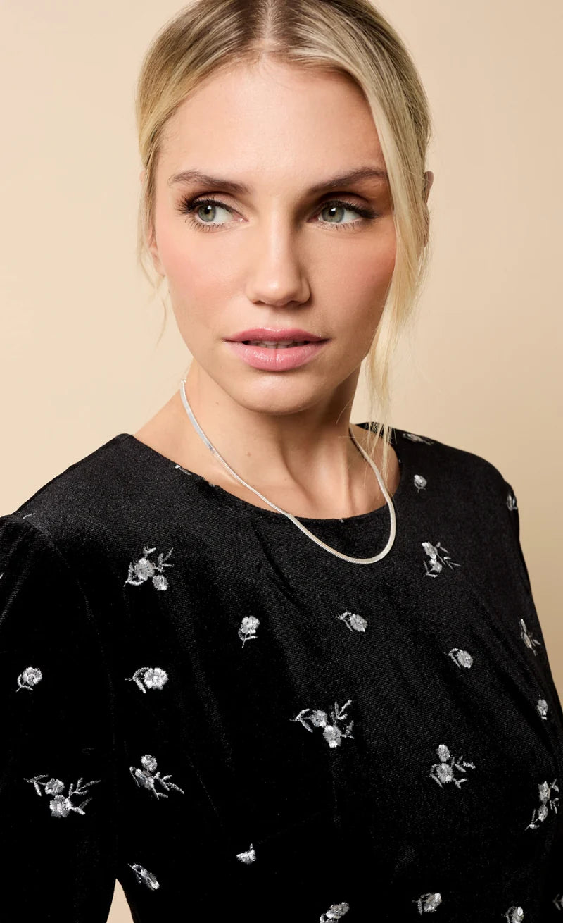 Step into elegance with the Black Velvet Embroidered Mini Dress. Featuring a classic round neck and long sleeves, this dress...