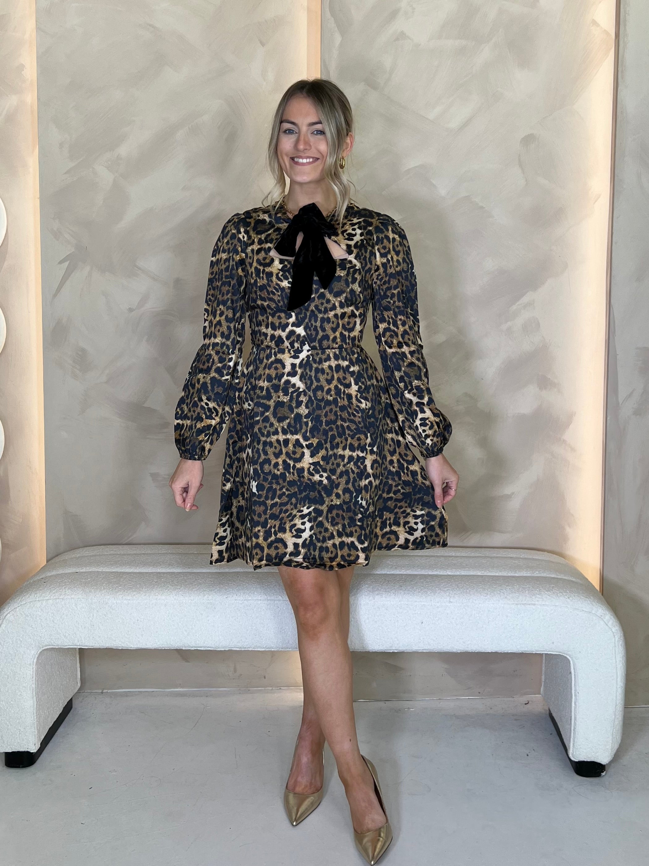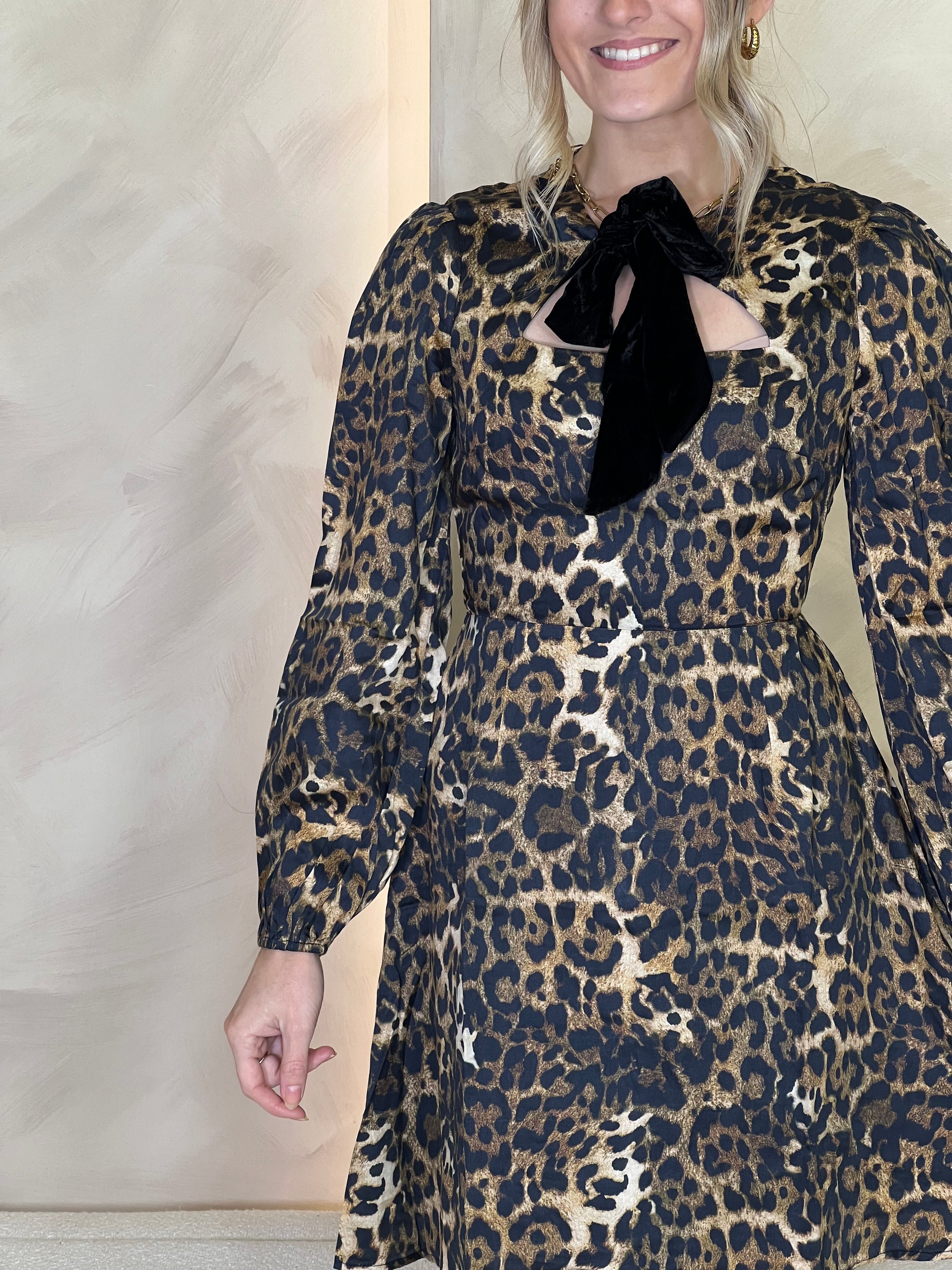 Cut to a playfully feminine silhouette, The India mini dress is a real head turner. Designed with a flattering skater skirt and finished in a striking leopard print, it features soft blouson sleeves and a luxe velvet ribbon that ties neatly at the neck. Whether it’s a cocktail party or a night on the town, this dress brings bold energy and timeless elegance.