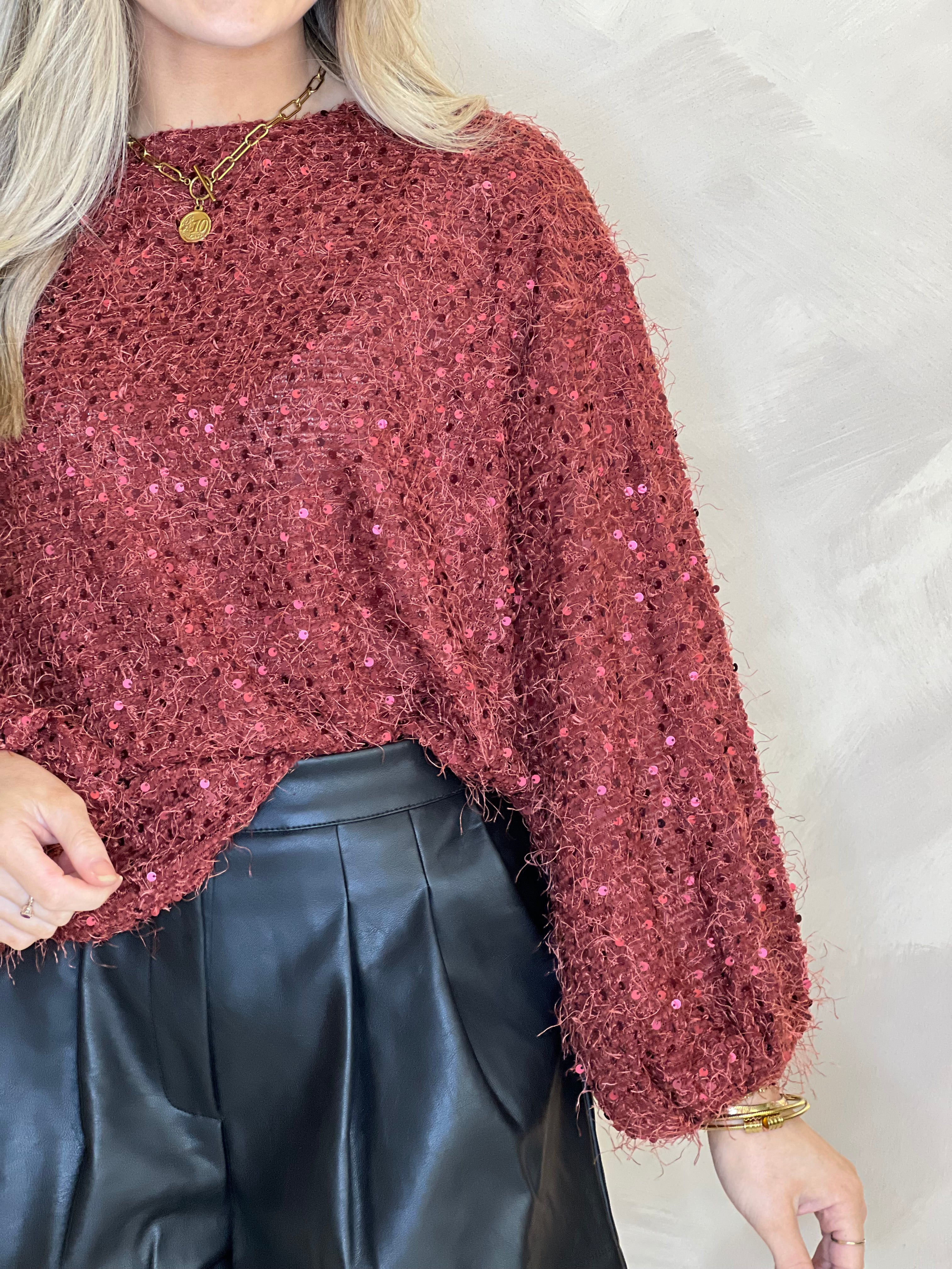 Add a pop of sparkle to your wardrobe with this cozy cherry sequin eyelash jumper. Designed with a round neck...